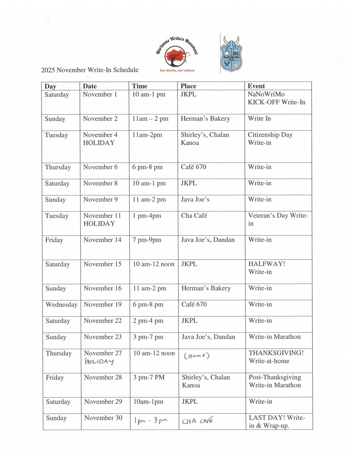 For those who like lists, here is the MaNaNoWriMo Schedule-List! Join us to write. If you aren’t writing a novel, join us anyway! Write with us. It’s fun. It’s rewarding and creative and a valuable experience.