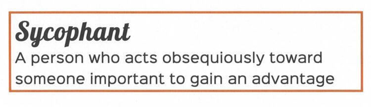 An unpleasant word for an unpleasant person. We all need characters in our stories and here is one insincere flatterer ready-made. It relates back to 5th century BC Greece and slanderers who brought false claims to the justice system of the day. It’s literal meaning relates to “revealer of figs” or “showing the fig” and causes debate among scholars. Perhaps sycophant came to be used because it was illegal to export figs in Greece and those who made accusations of such abuse were lying; perhaps because shaking fig trees was necessary to get to the figs (not sure how that relates); or because there was a derisive gesture of putting the tongue between two fingers used for informers and this was referred to as showing or giving the fig! Whether referring to informers (a meaning from the past and still in use in France) or just to those who toady and flatter the powerful, the sycophant is rarely on the side of right. Add one to your story, now!